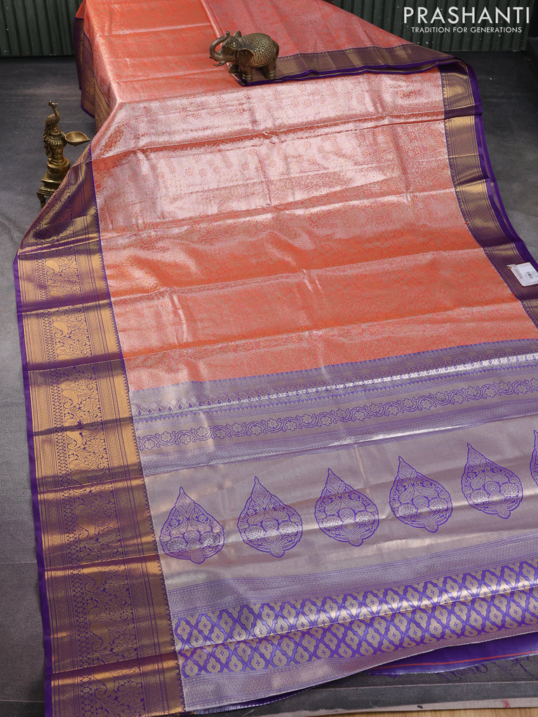 Bangalori tissue silk saree peach shade and reddish pink with allover zari woven brocade weaves and long zari woven border
