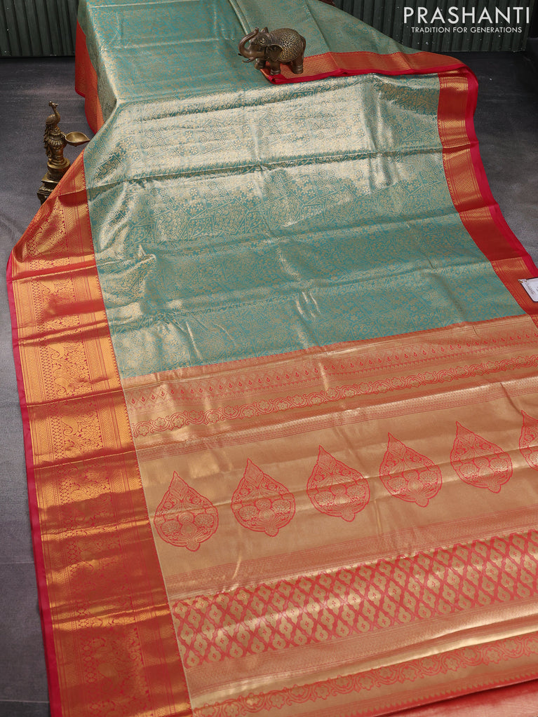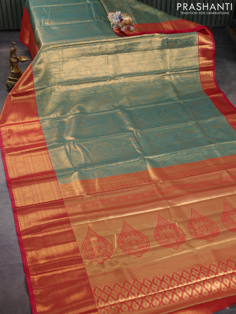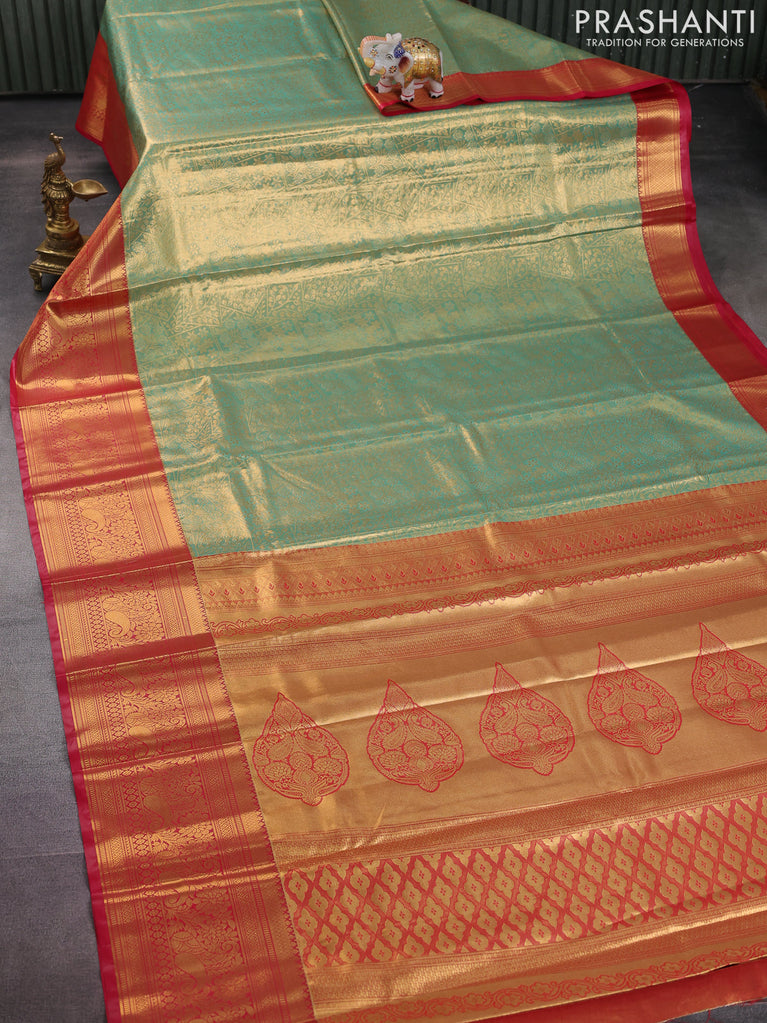 Bangalori tissue silk saree teal green shade and red with allover zari woven brocade weaves and long zari woven border
