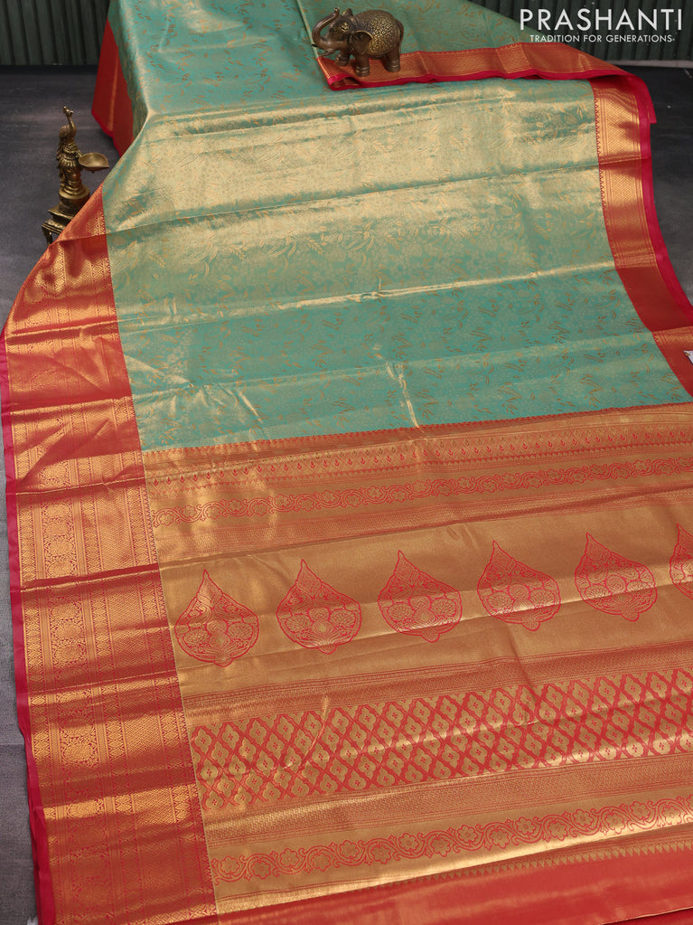 Bangalori tissue silk saree teal green and red with allover zari woven brocade weaves and long zari woven border