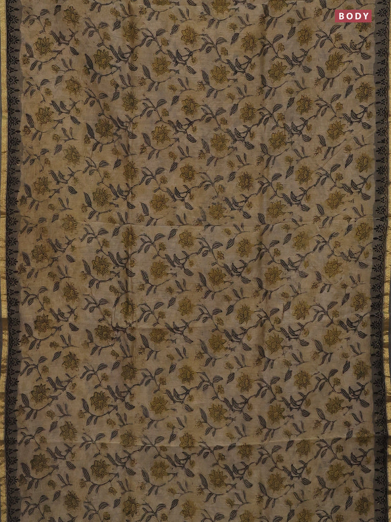 Chanderi bagru saree sandal and grey with allover prints and small zari woven border