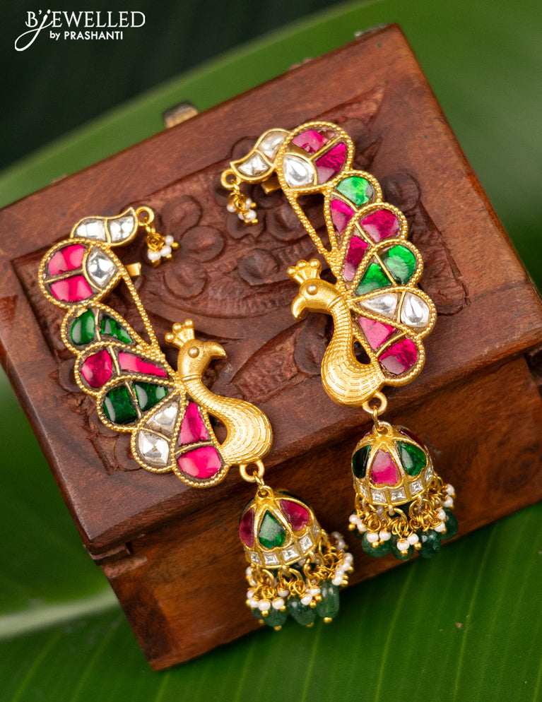 Antique earcuff jhumka peacock design with green jadau kundan stones and pearl hangings