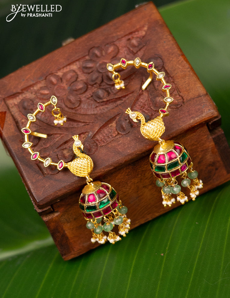 Antique earcuff jhumka peacock design with jadau kundan stones and pearl & beads hanging