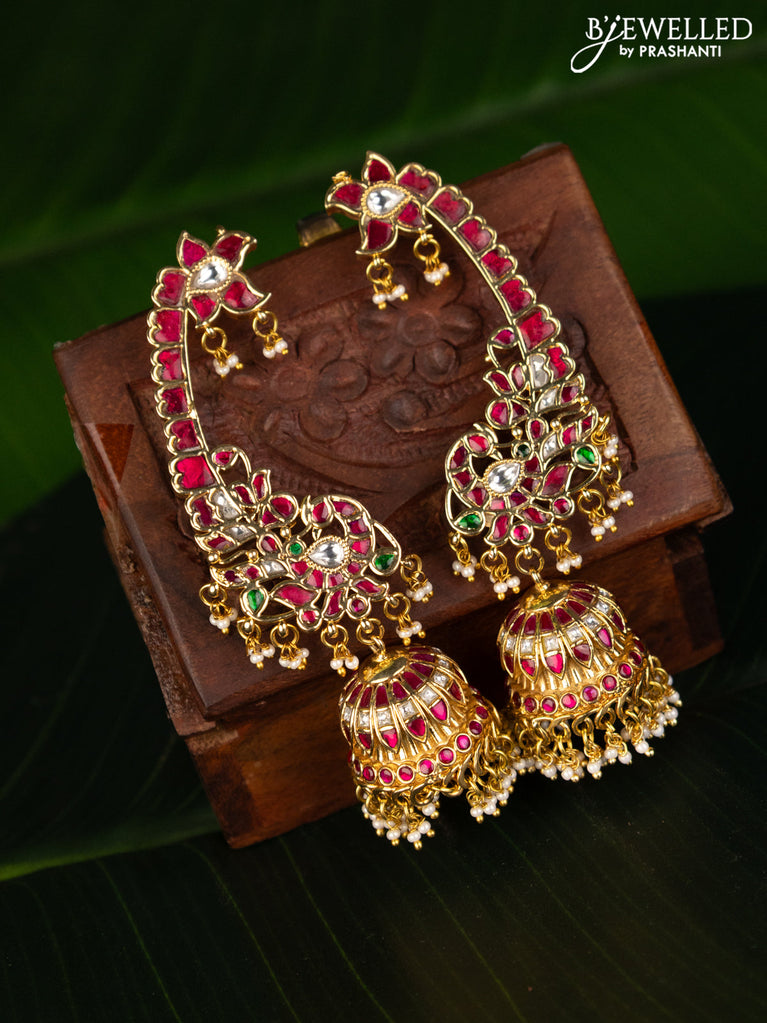 Antique earcuff jhumka with pink kemp & cz stones and pearl hangings