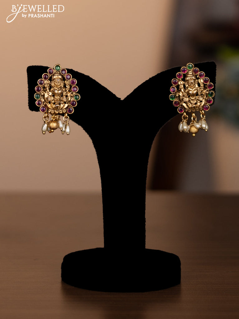 Antique double layer necklace lakshmi design with kemp stones and pearl hangings