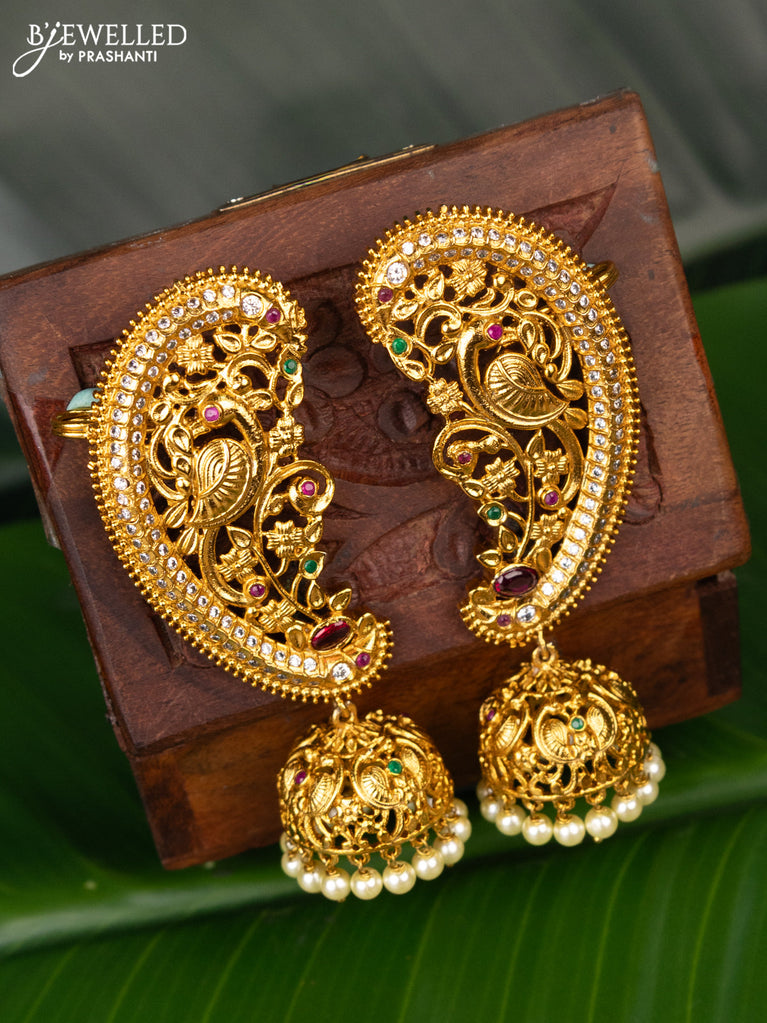 Antique earcuff jhumka peacock design with kemp & cz stones and pearl hanging