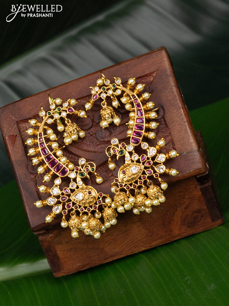 Antique earcuff jhumka peacock design with kemp & cz stones and pearl hangings