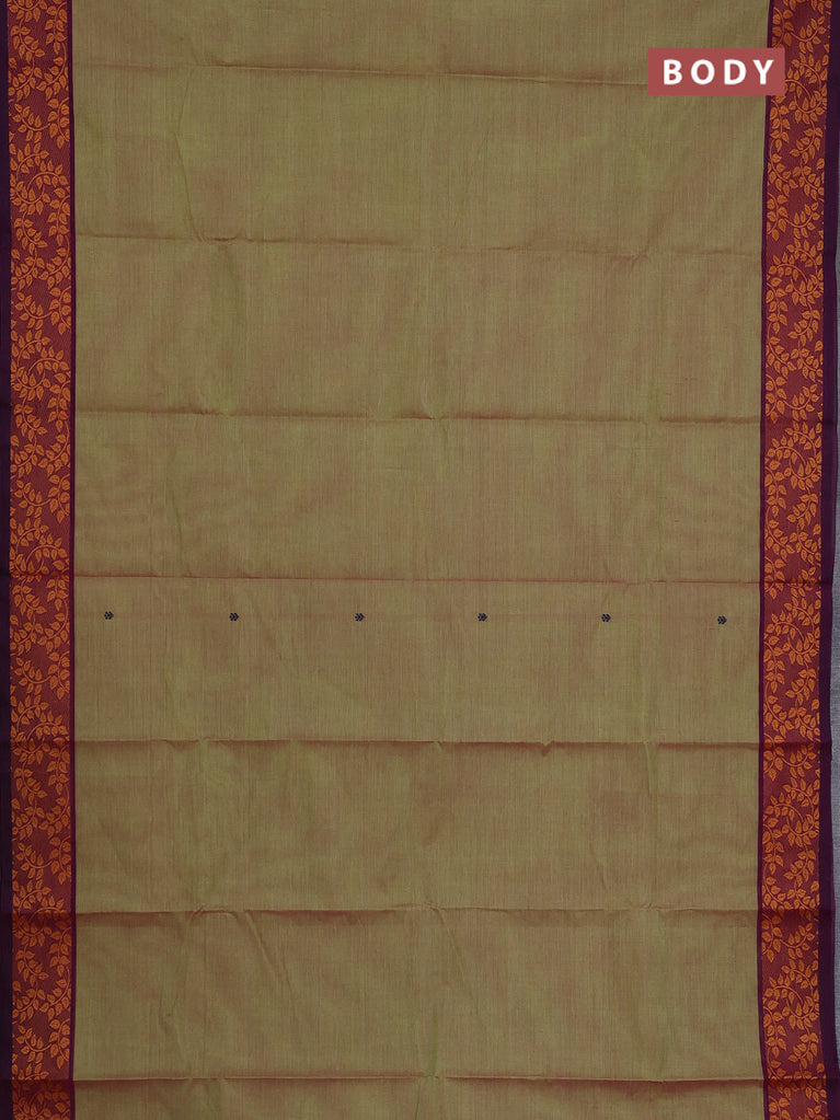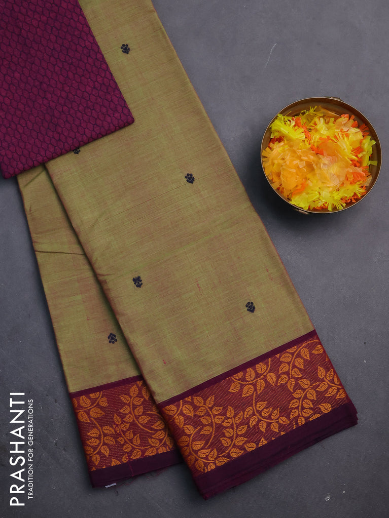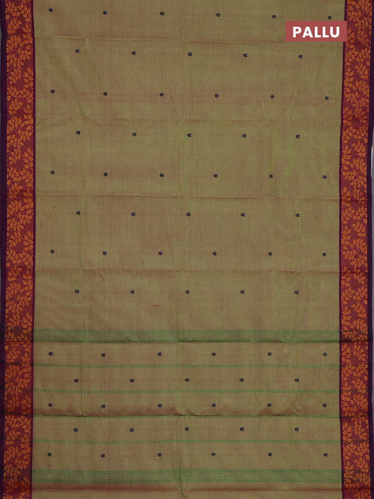 Chettinad cotton saree light green and dark magenta pink with thread woven buttas and leaf design border