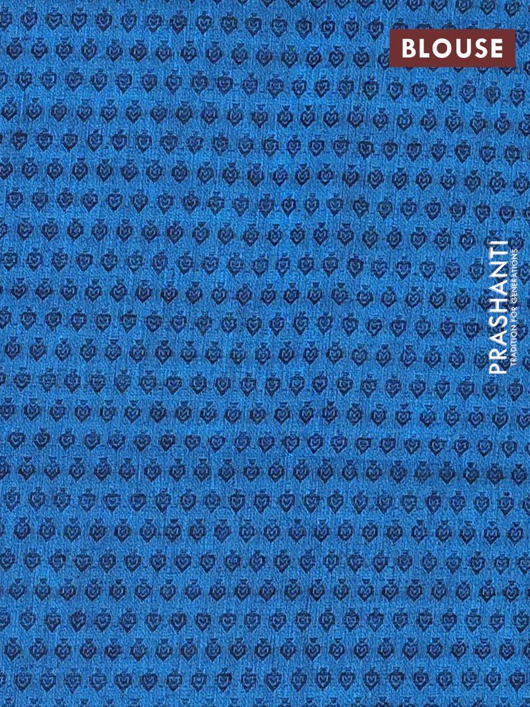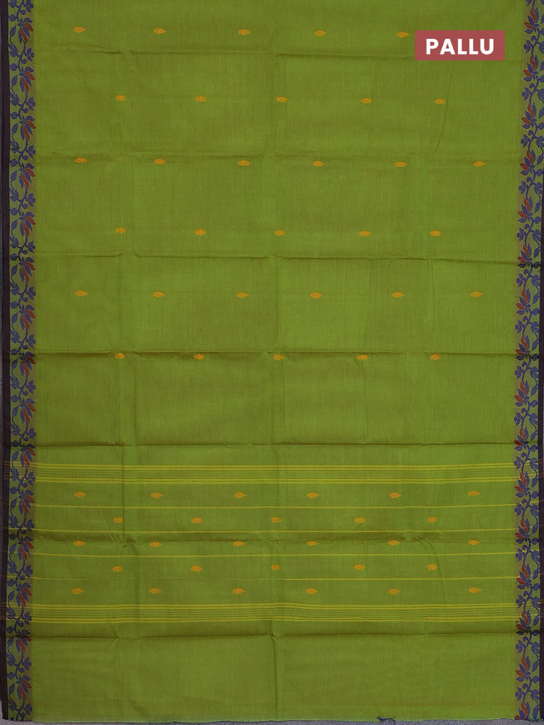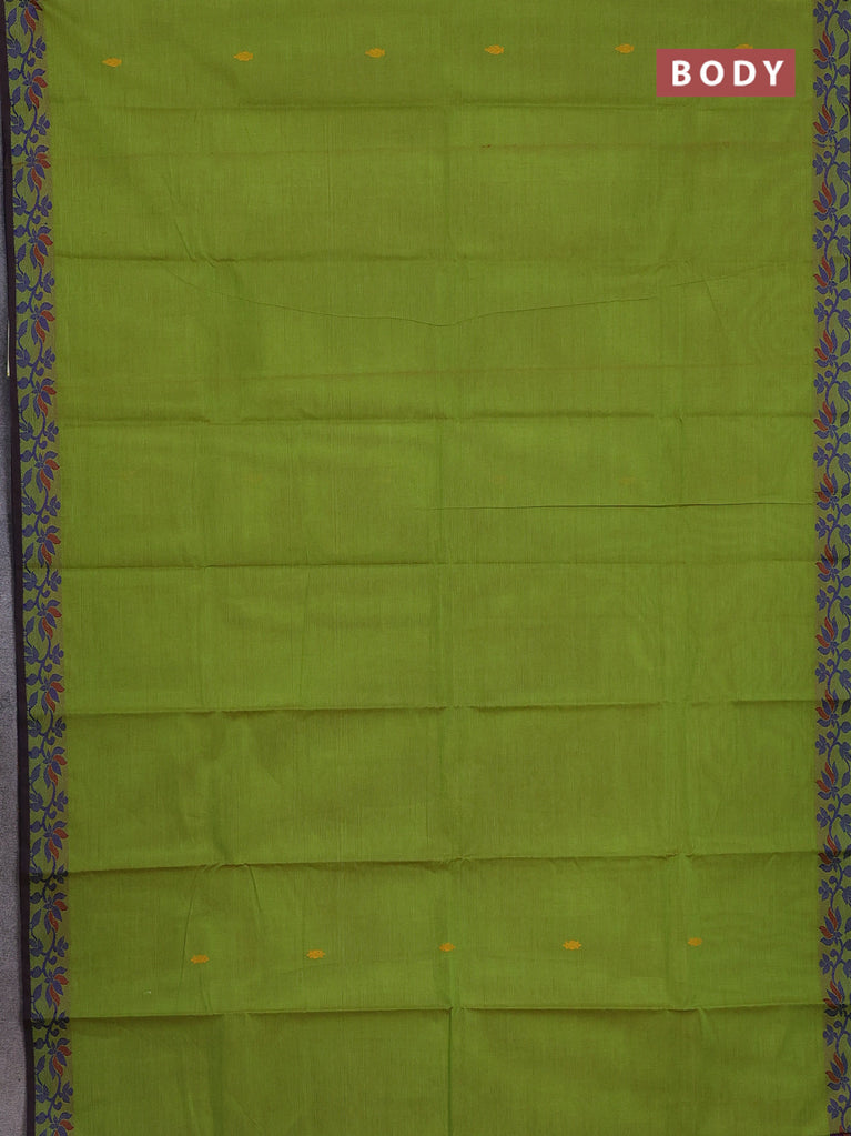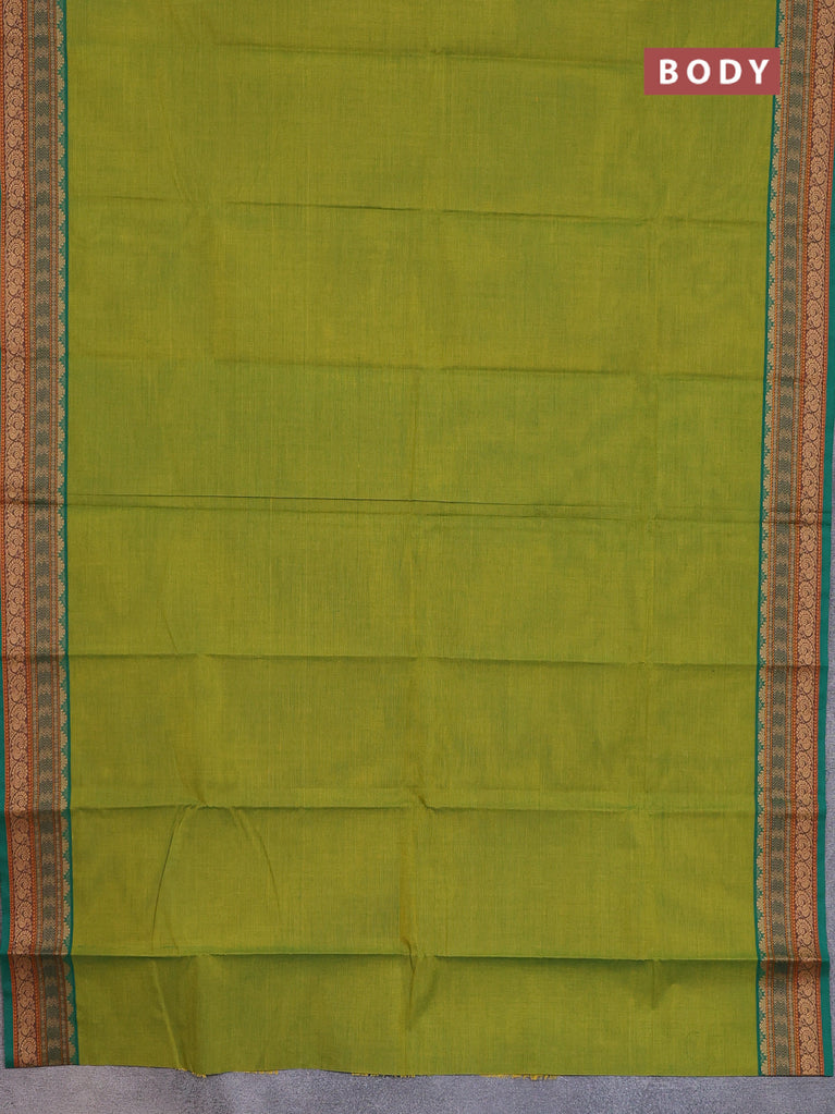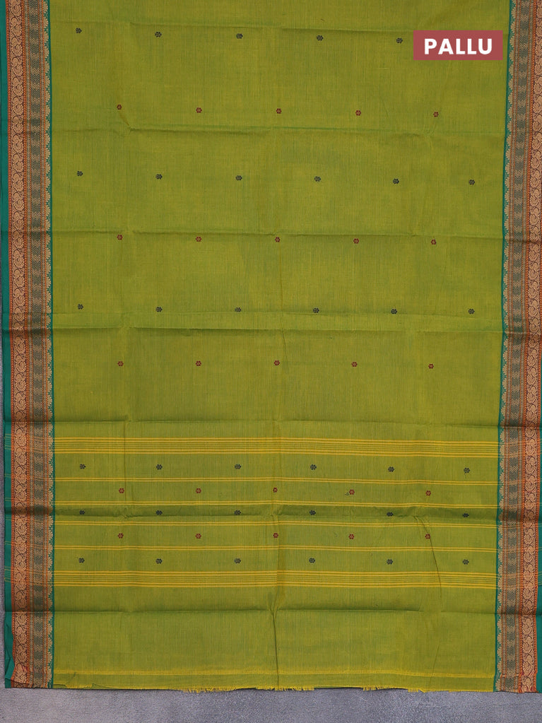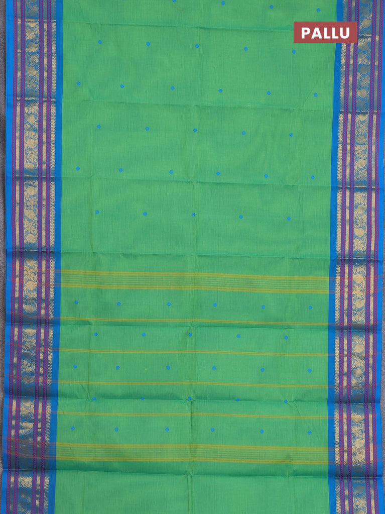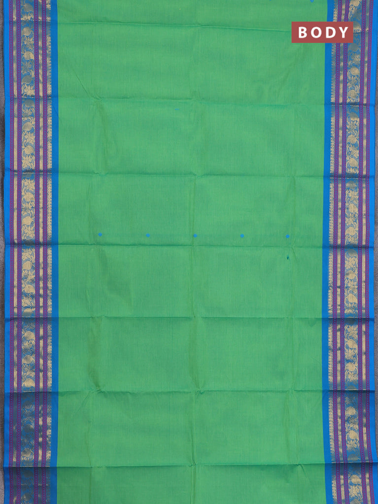 Chettinad cotton saree light green and peacock blue with thread woven buttas and leaf design border