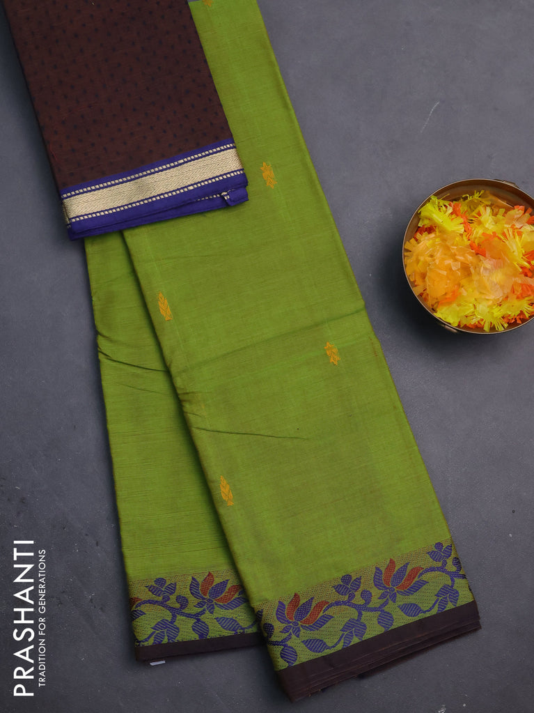 Chettinad cotton saree light green and brown with thread woven buttas and thread woven border
