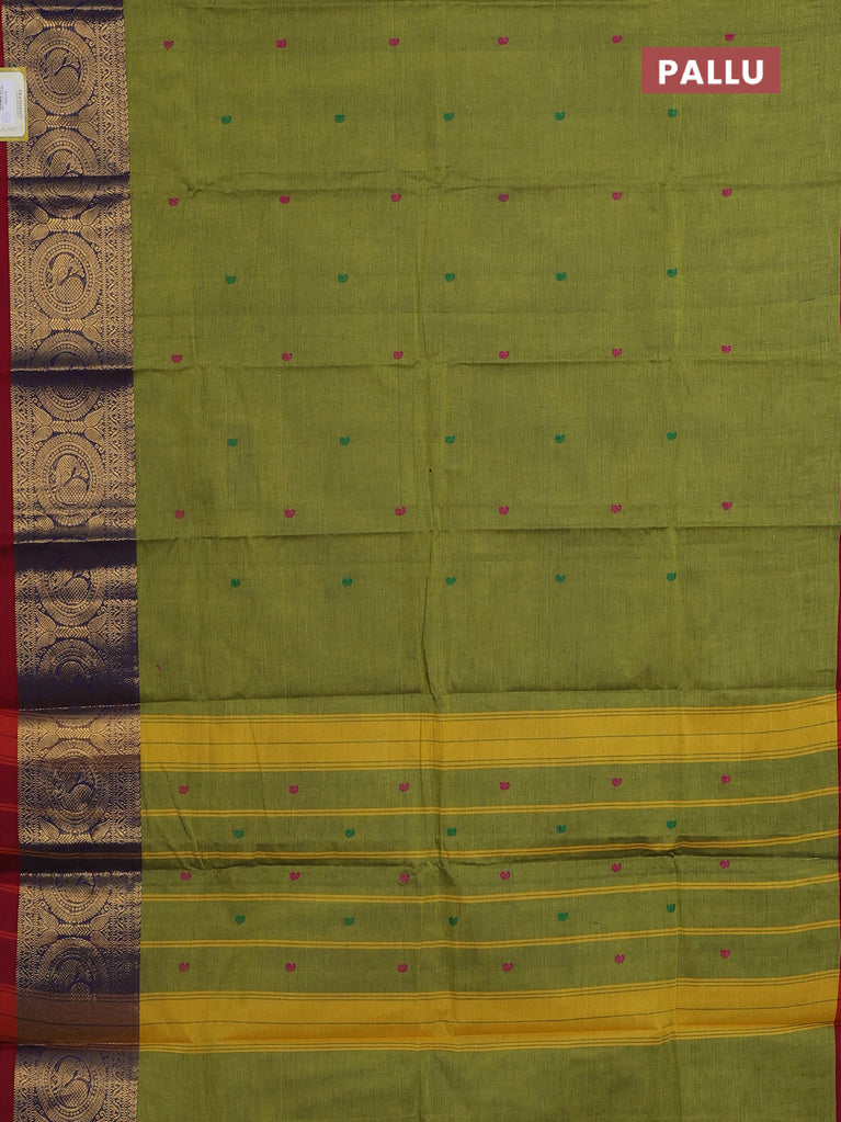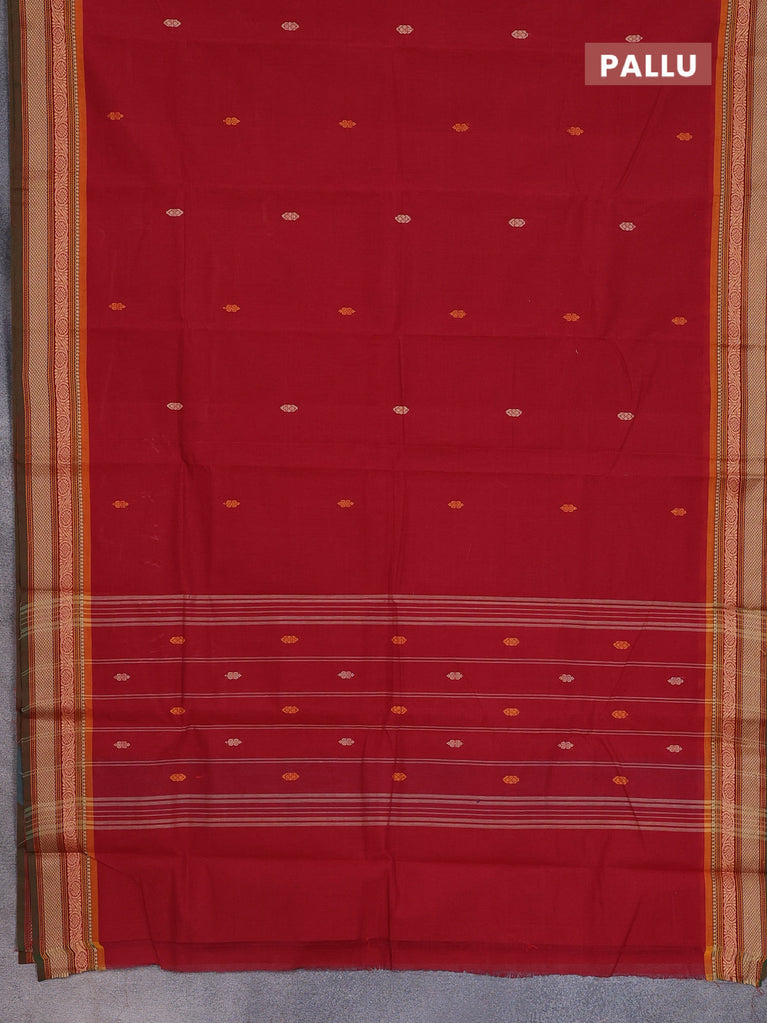 Chettinad cotton saree kumkum red and sap green with thread woven buttas and thread woven border
