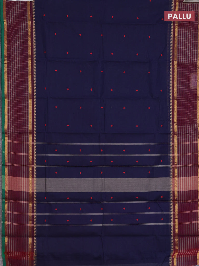 Chettinad cotton saree navy blue and green with thread woven buttas and rettapet zari checked border