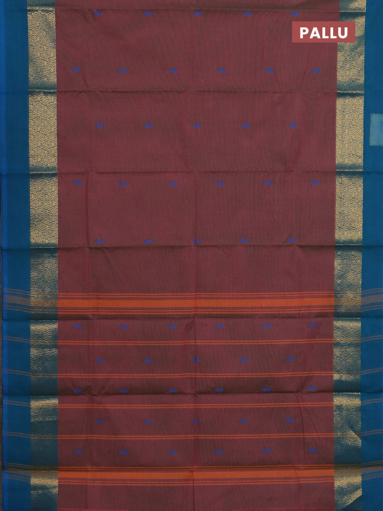 Chettinad cotton saree navy blue and dark magenta pink with thread woven buttas and zari woven border