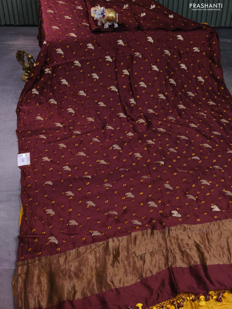 Chiniya silk saree deep maroon and mustard yellow with allover zari buttas & bandhini prints in borderless style