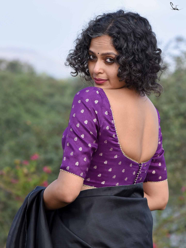 This vibrant purple brocade blouse, Chiuli Vasant, is made from a lightweight viscose blend. With its round neckline and elbow-length sleeves, it adds a lively energy to any outfit.