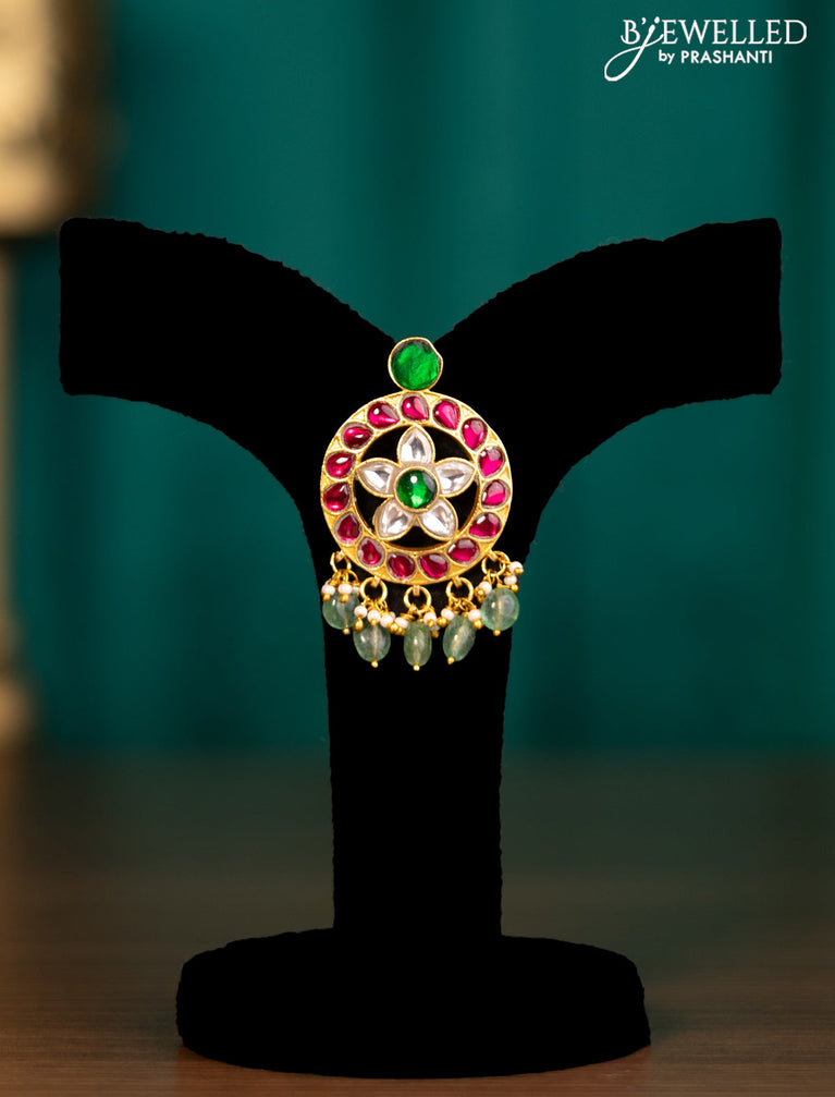 Antique pendant set lakshmi design with green kemp & cz stones and golden beads hanging