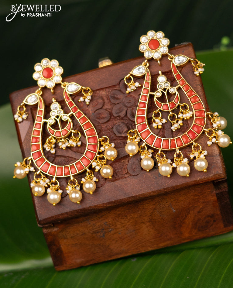 Antique screw type earrings chandbali design with pavalam & kundan stones and pearl hangings