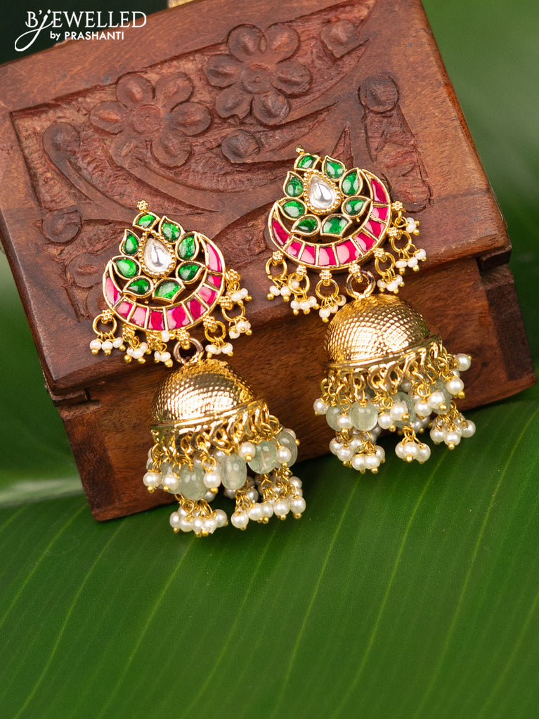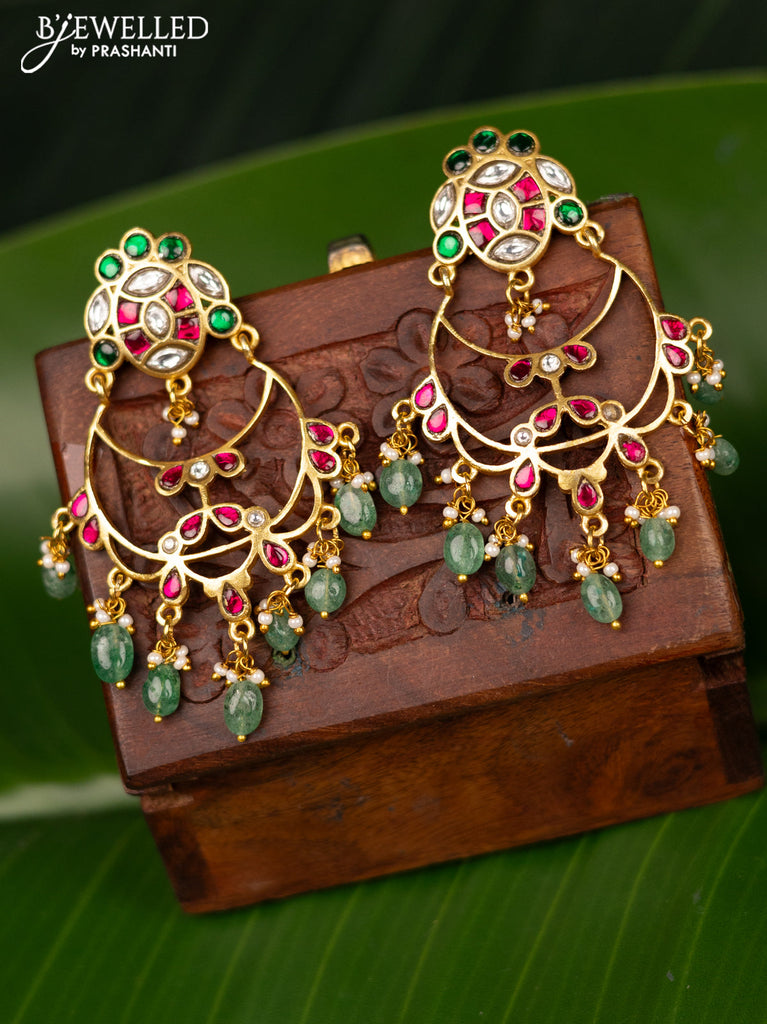 Antique screw type jhumka chandbali design with jadau kundan stones and pearl & beads hanging