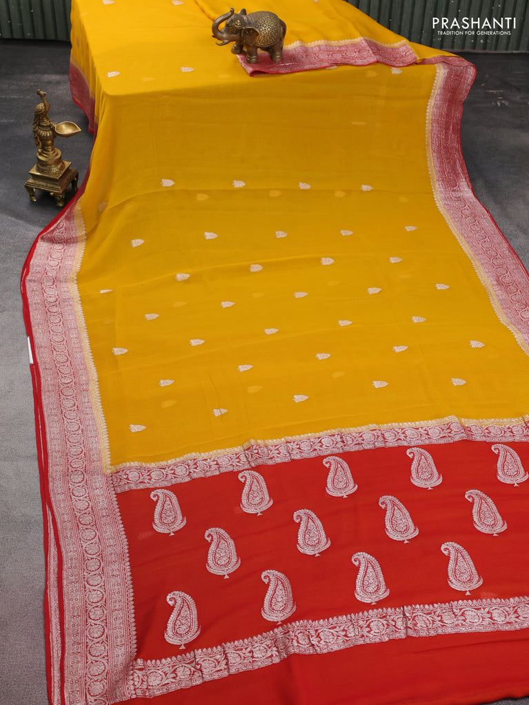 Banarasi chiffon silk saree mustard yellow and red with silver zari woven buttas and floral silver zari woven border