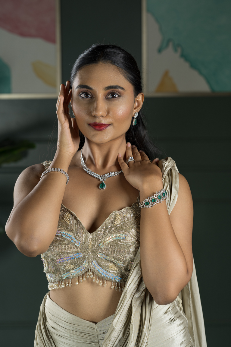 This elegant Designer Sabhya Sanchi Saree is an eye-catching timeless piece crafted with high-quality hand embroidery work featuring a pistra green color contrast with a blouse adorned with heavy work on the back and front pallu. Perfect for elevating your style in any occasion.