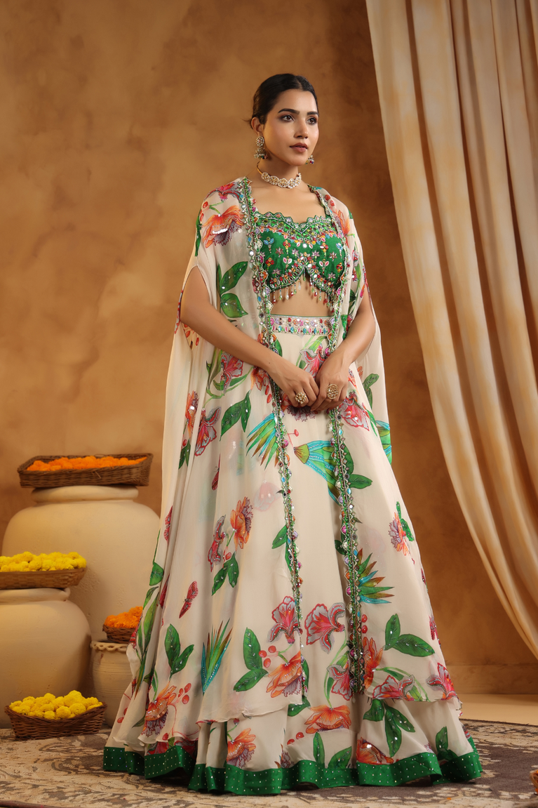 Step into a world of timeless charm with our Floral Traditional Silk Lehenga. Crafted from premium silk, this lehenga showcases a vibrant burst of colors adorned with intricate floral patterns, reflecting the richness of traditional artistry.