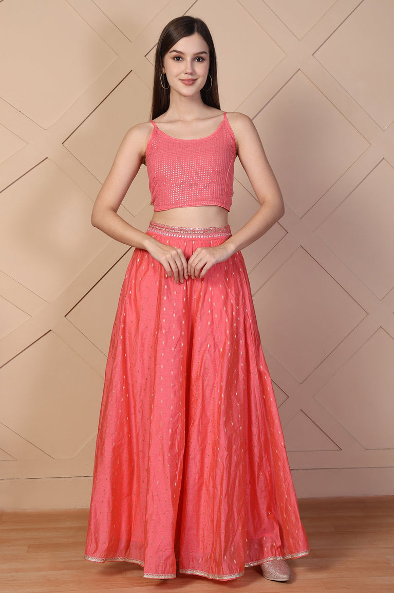 Coral Sequined Crop Top with Flared Skirt and Embroidered Short Jacket Set