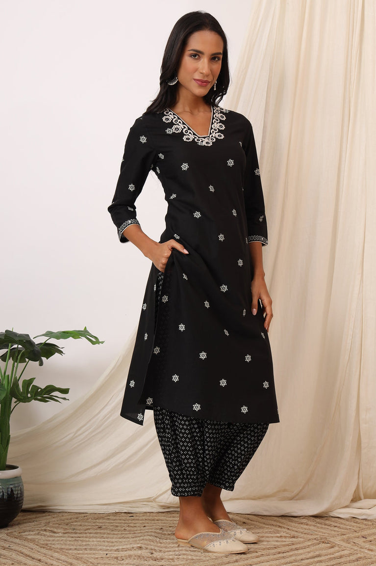 Black Beadwork Embroidery Kurta In Textured Cotton