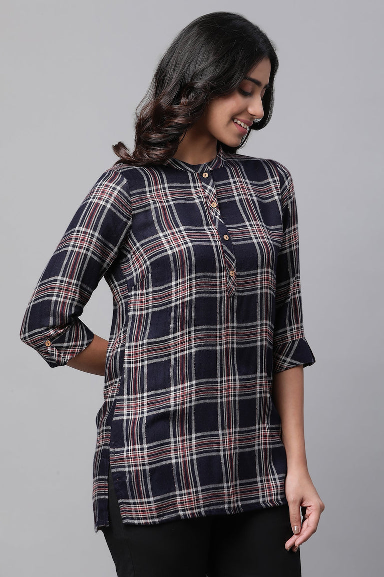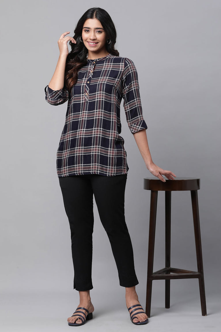 Amp up your casual look with this stylish short kurti by Aurelia. Crafted in premium fabric, it has checks all over and band collar with placket.