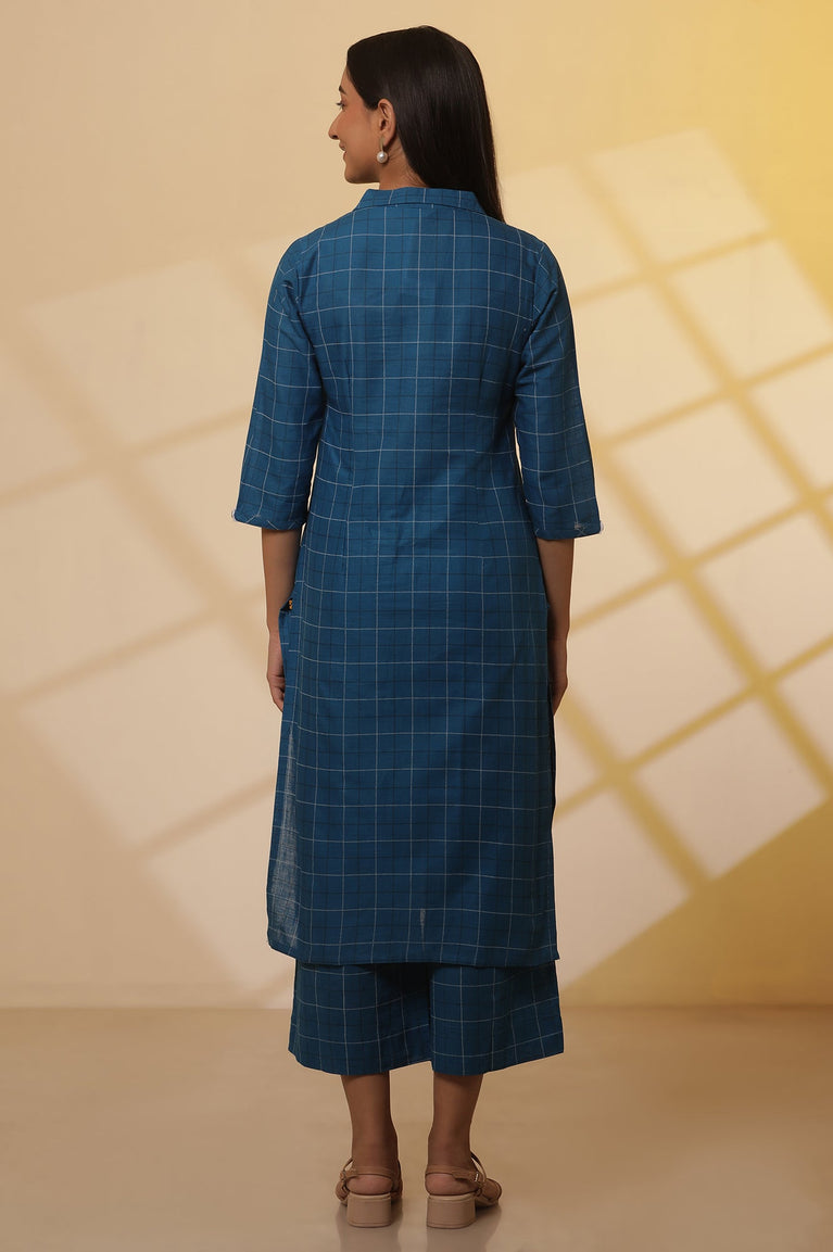 Blue Checker Pure Cotton Straight Kurta and Trouser Set