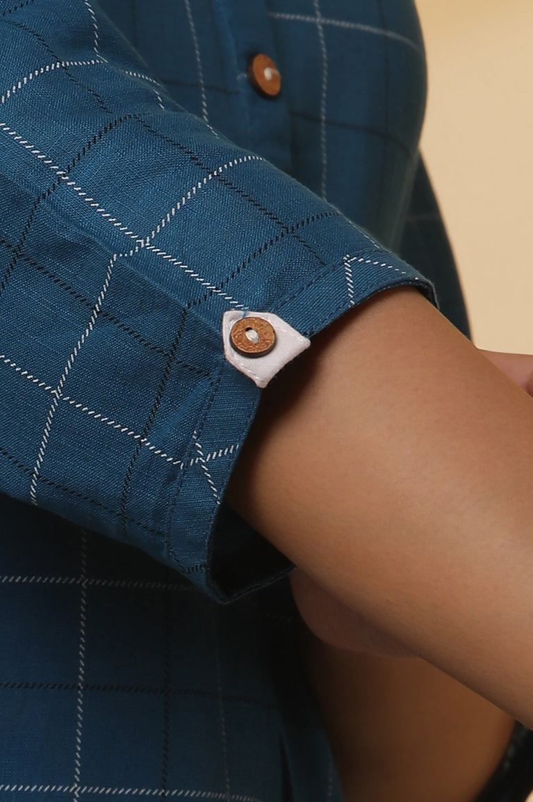 Simple and timeless, this printed blue check kurta is a wardrobe staple. It comes with a neat and crisp shirt collar, wooden buttons on the placket, an inverted box pleat at the front and a white coloured tab on the sleeves.