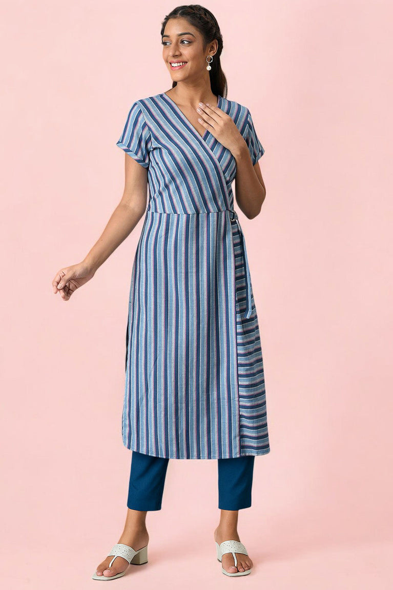 Ease into this co-ord set that encompasses a smart seer sucker checks kurta and a striped trouser. Complimented with fine details like striped side panels, placket, mandarin collar, and cuff it will certainly be a refreshing addition to your wardrobe.
