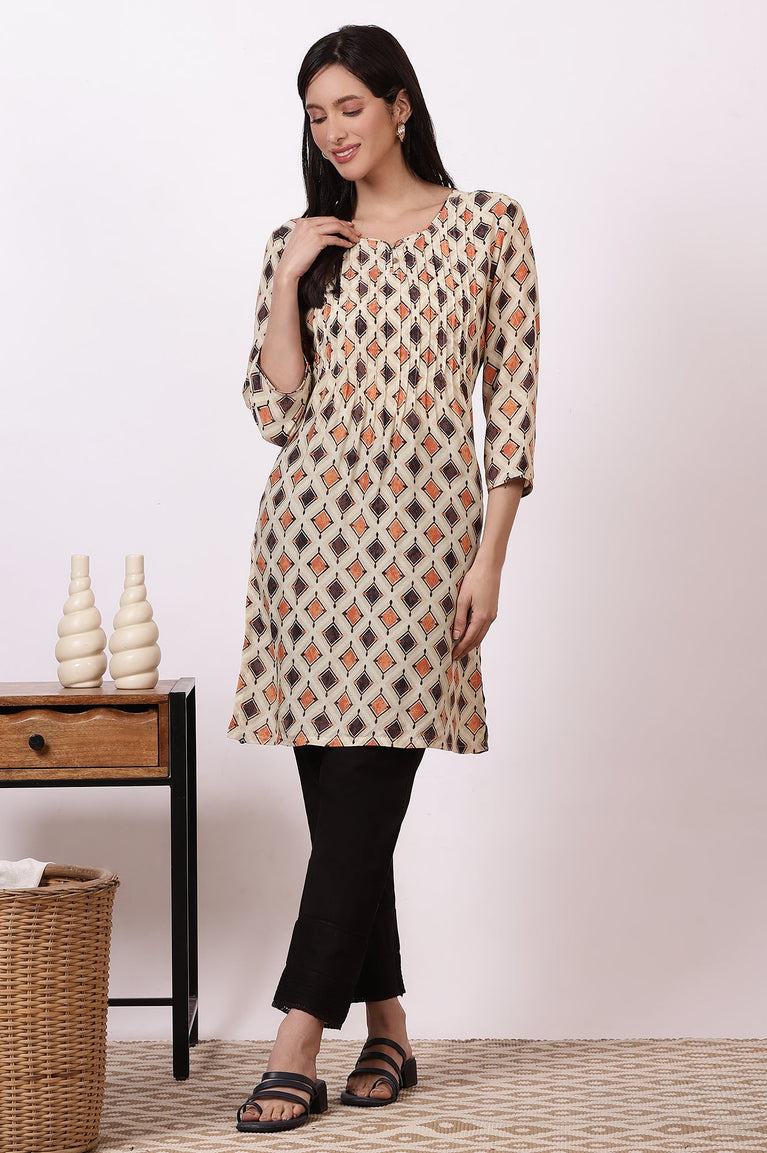 This beautiful beige kurti showcases vibrant multi-colored prints, exuding charm and elegance. Featuring delicate pintuck details and 3/4th sleeves, it adds a touch of sophistication to your look. The relaxed fit ensures all-day comfort while maintaining a stylish appeal, making it a versatile choice for casual outings, workwear, or festive gatherings.