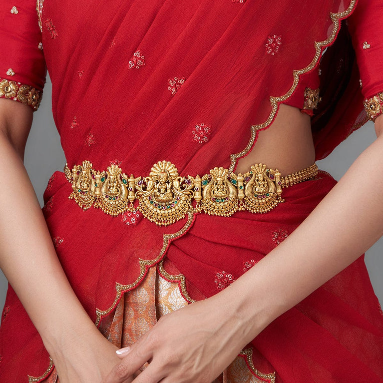 Kushal's Ruby Bridesmaid Waistbelt/Kamarband for saree Emballished with stones A wonderful choice for brides and bridesmaids, this antique-styled jewellery is perfect to be teamed up with silk sarees and half sarees at weddings and sagai. Encrusted with ruby red stones, this waist belt comes with Goddess Lakshmi and floral motifs that shows delicate craftsmanship. Wear this kamarbandh to other traditional ceremonies to heighten your feminine charm.
