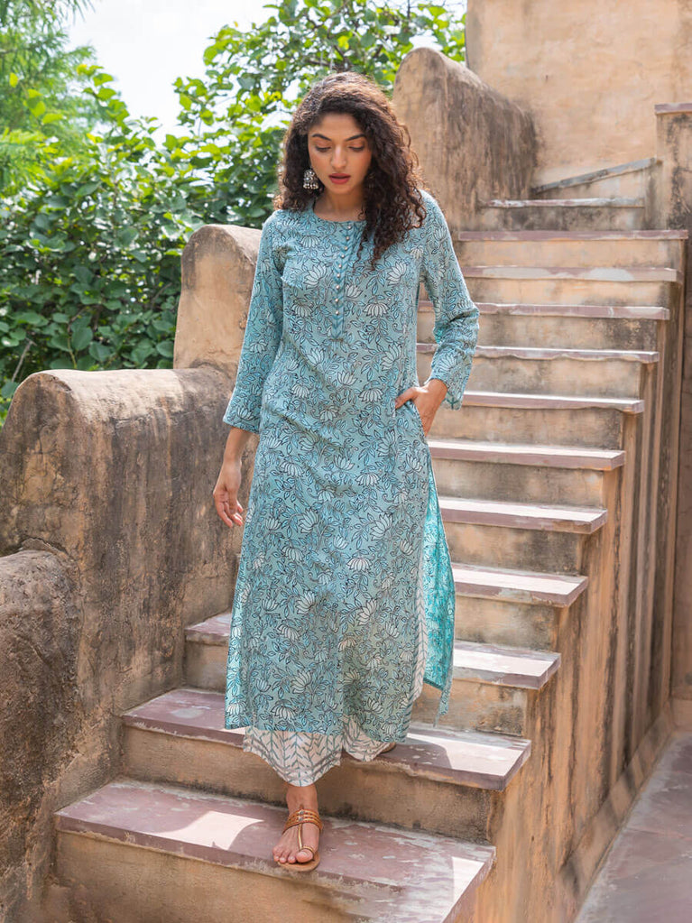 Set of 3 - Anant Organic Cotton Block Printed Long Kurta with Jacket