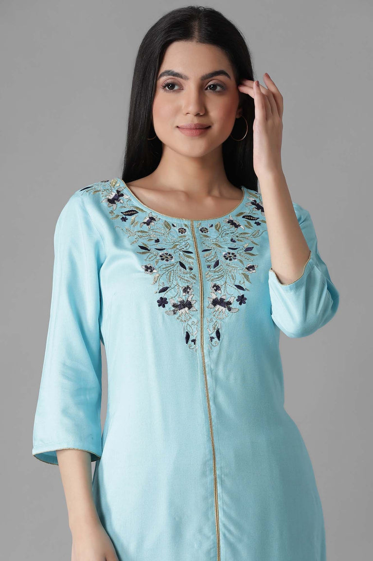 Blue Embroidered Straight kurta-Parallel Pants-Dupatta Set