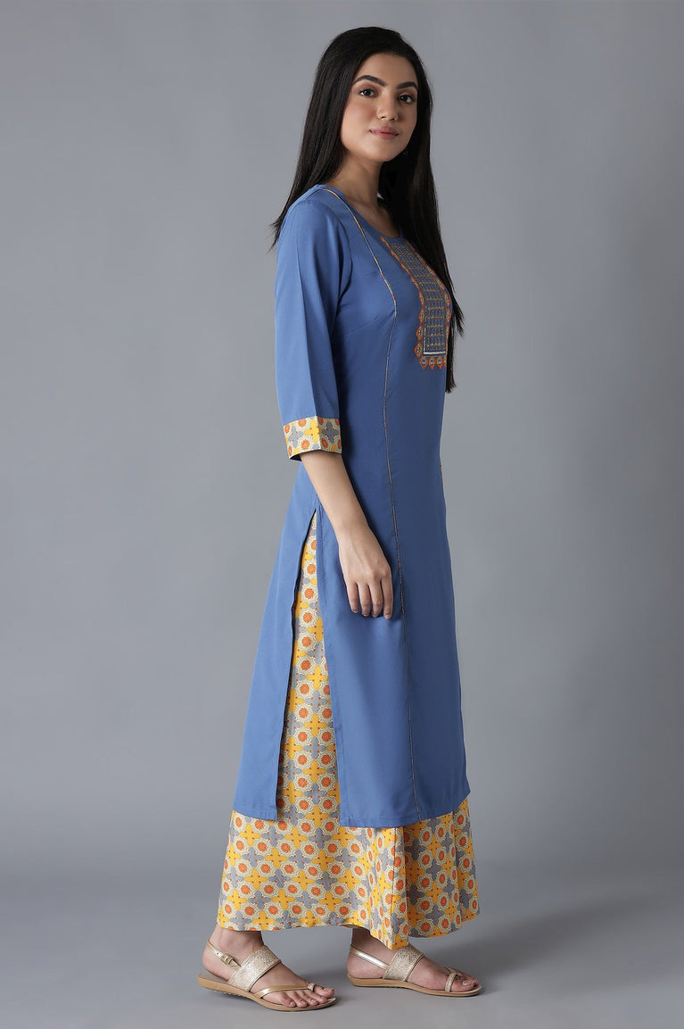Dress up in the classic silhouettes with intricate detailing, lavish prints and rich hues to accentuate your festive look. This kurta set contains a blue glittered geometric print panelled kurta featuring zari embroidered yoke with round neckline and three-quarter sleeves. Well-matched with ankle length solid palazzos.