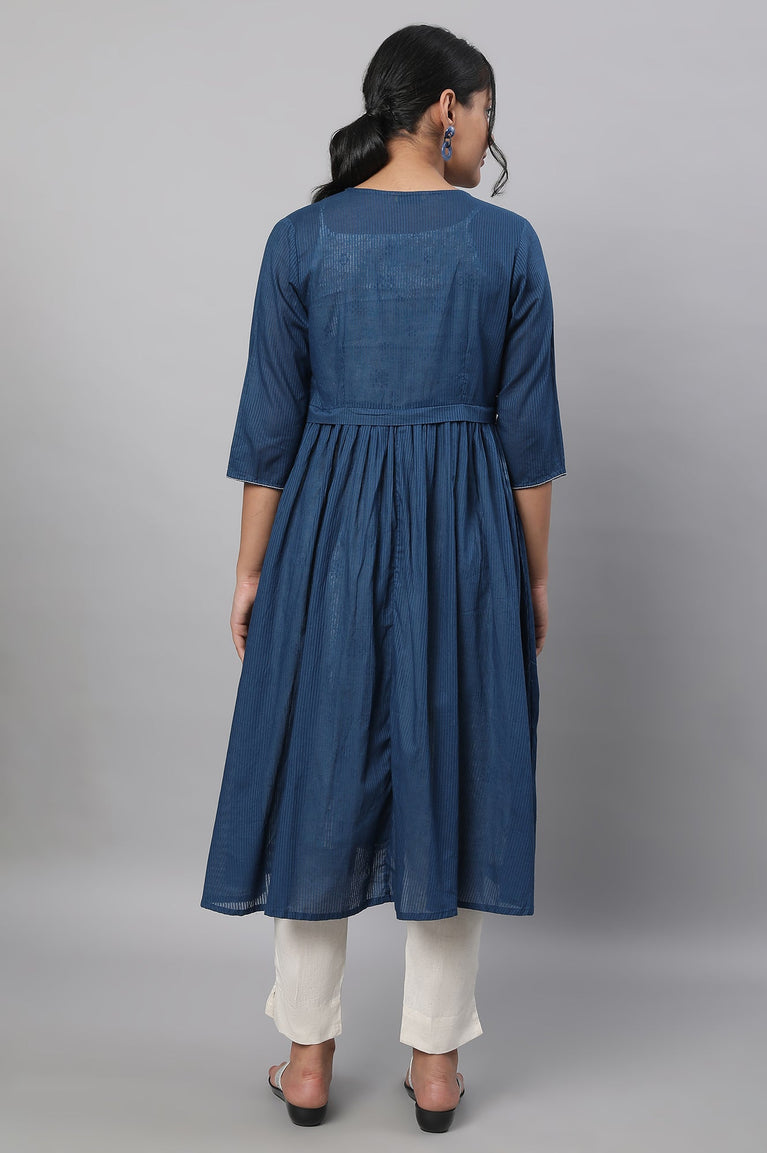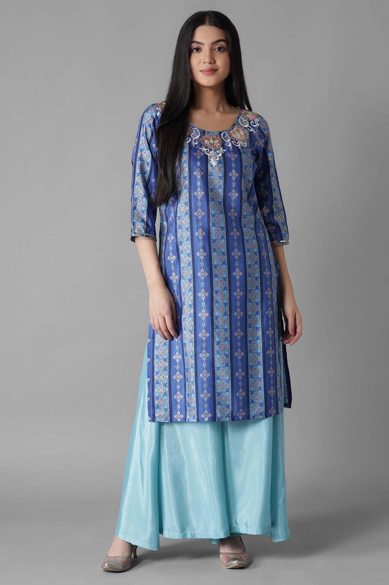 Be dressed la mode this festive season. Perfect for all occasions, this kurta set contains a blue all-over striped foil print kurta well-matched with solid palazzos.