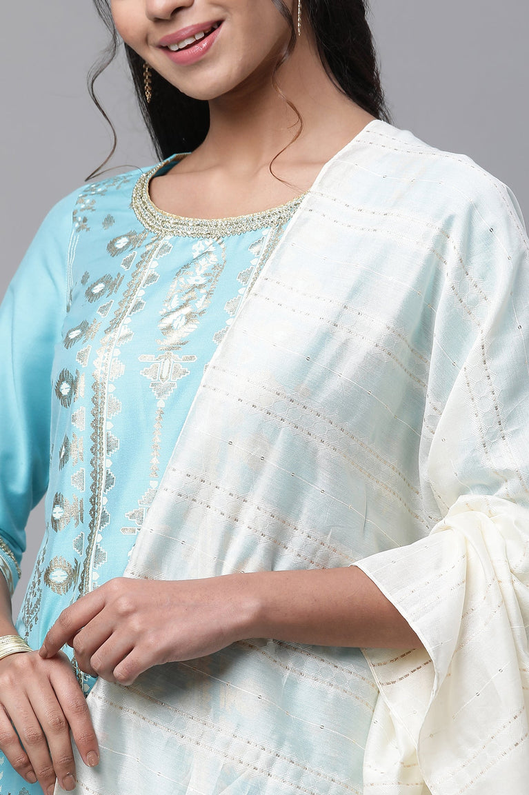 Blue Foil Printed Embellished Kurta, Pants and Dupatta Set