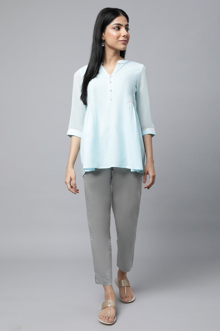 Get a smart office lunch look in this pretty and chic blue gathered kurta set. The set has solid cotton kurta with elegant details. It is paired with grey solid trousers.