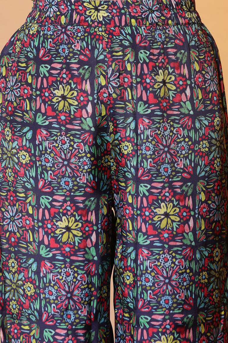 Blue Floral Printed Straight Shantung Kurta and Pants Set