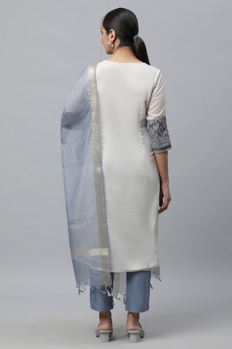Blue Yarn-Dyed Kurta, Trousers And Dupatta Set