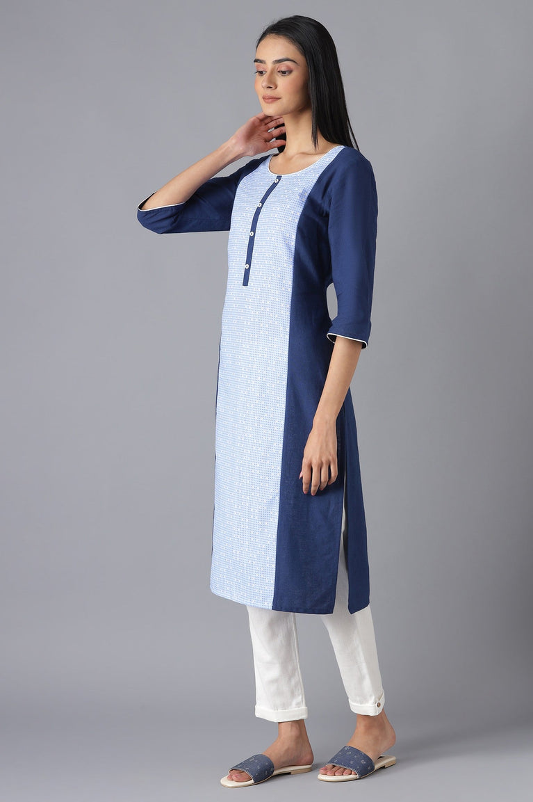 Step out in style for a casual day out or a elevate your office wardrobe with this modern ethnic kurta set. The set includes blue solid straight fit kurta with printed front panel and it is paired with solid trousers.