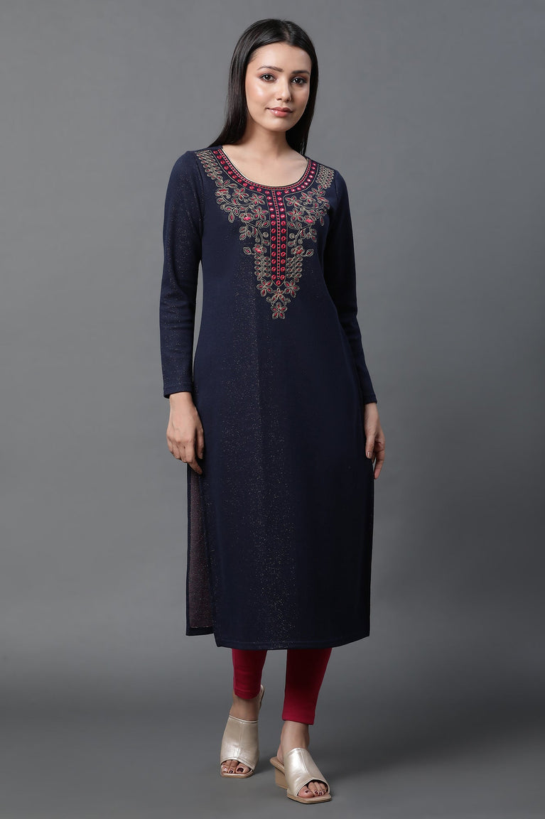 Blue Warm Jacquard Winter Kurta and Tights Set