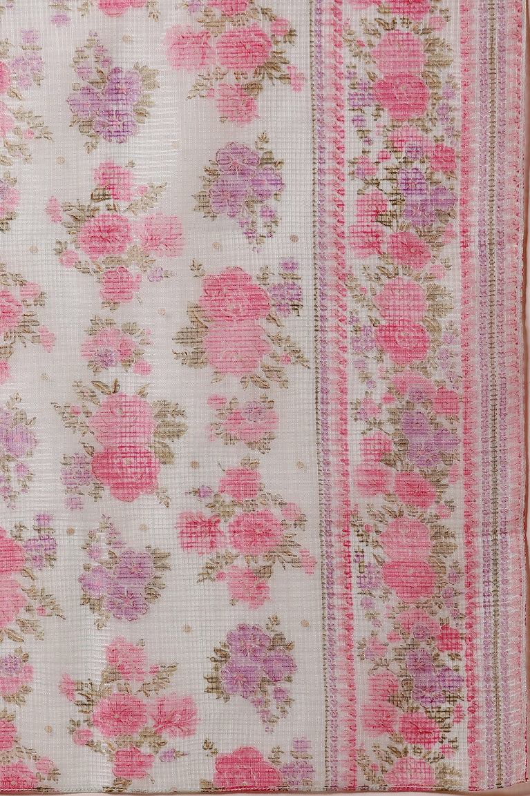 A beautiful straight printed kurta set featuring multi-coloured floral print. The shading technique in print adds a premiumness to its look. It also has stylised embroidered neckline, which makes the set a perfect choice for day event. It comes with pink pants having border at hemline and kota dupatta.