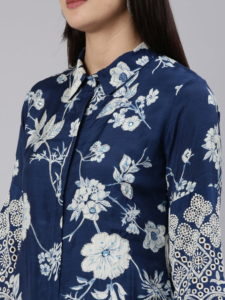 Navy Blue Linen Embroidered Two Piece Set