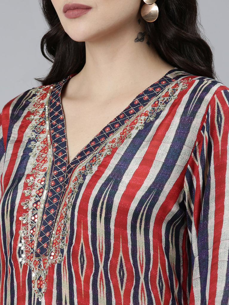 Neeru's Blue Regular Straight Chevron Kurta Sets And Trousers With Dupatta Look Your Best This Season With Neeru's Chic And Timeless Style. This Chevron Set Has A Little Something For Everyone, From The Sharp-Looking Shirt To The Comfy Trousers And Matching Dupatta, You'Ll Be The Talk Of The Town!