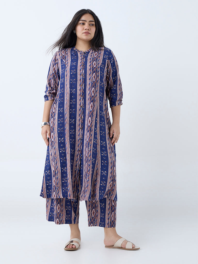 Festive days call for ease wrapped in elegance, and this indigo blue kurta from Diza captures just that spirit. Crafted from lightweight fabric, it radiates effortless grace through its delicate floral prints. The A-line silhouette flatters every form, while the band collar, button placket, and 3/4 sleeves lend a structured touch. Finished with a slip pocket for everyday practicality.
