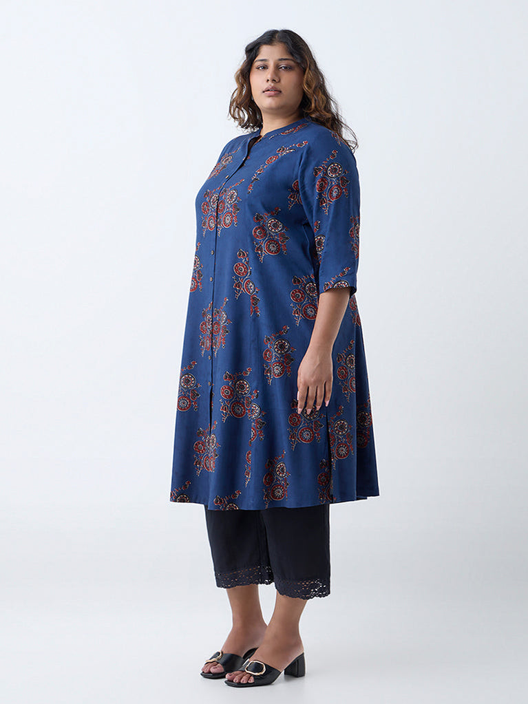Diza presents this indigo A-line kurta adorned with a floral print for a timeless appeal. It features a round neck, button-down front, and three-quarter sleeves, along with practical side pockets. Crafted from a quality fabric, it ensures comfort with every wear.