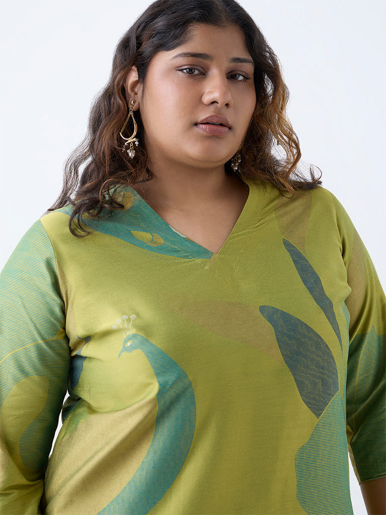 Add a pop of colour to your festive celebrations with this lime A-line kurta from Diza. Featuring playful botanical prints, a V-neckline, three-quarter sleeves, and a practical side pocket, it lifts your wardrobe with cheerful vibrancy—perfect for lively gatherings and seasonal festivities.