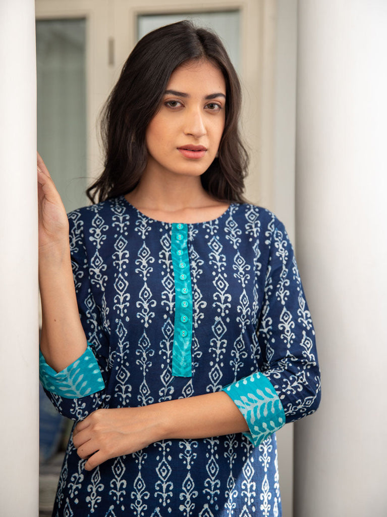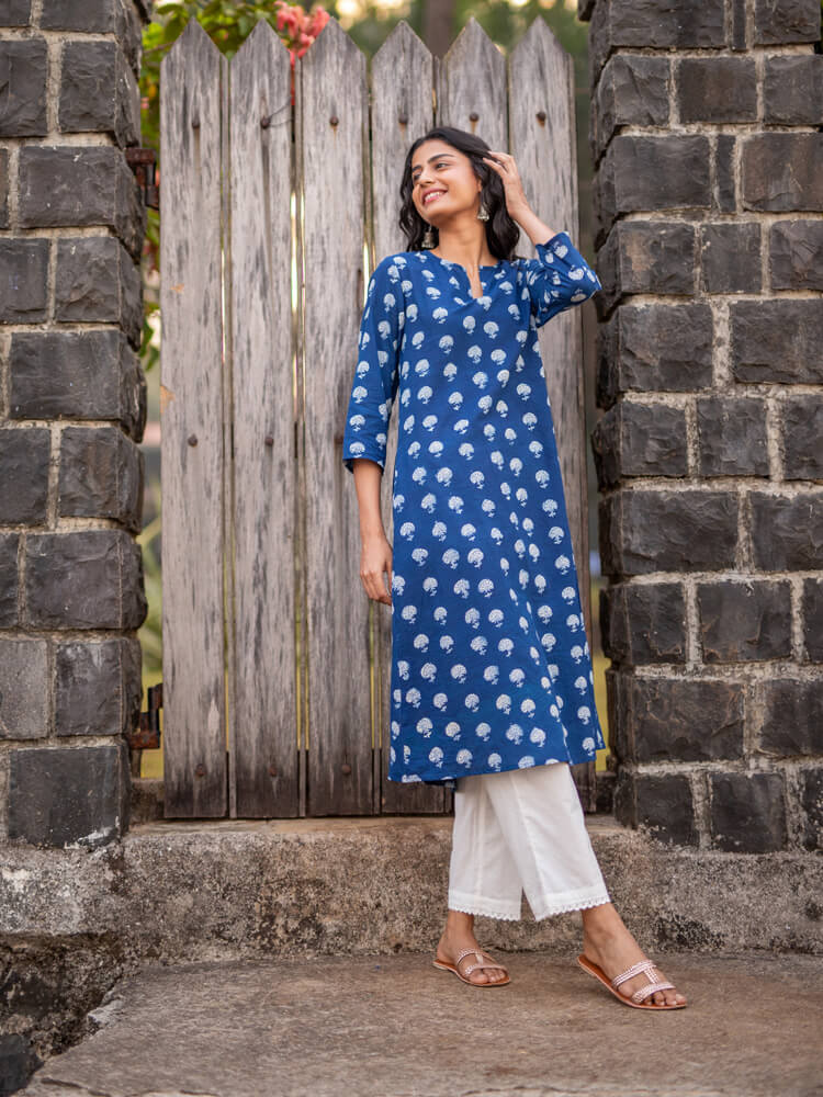 Stay effortlessly stylish with this light blue embroidered straight kurta. Crafted from breathable pure cotton, this kurta ensures all-day comfort while exuding a refreshing and elegant charm. The delicate print adds a touch of sophistication, while intricate embroidery enhances its graceful appeal. Designed in a classic straight-cut silhouette, it offers a flattering fit for a polished look. Perfect for casual outings, workwear, or festive gatherings, pair it with trousers, palazzos, or leggings and accessorize minimally for a timeless and refined ensemble.