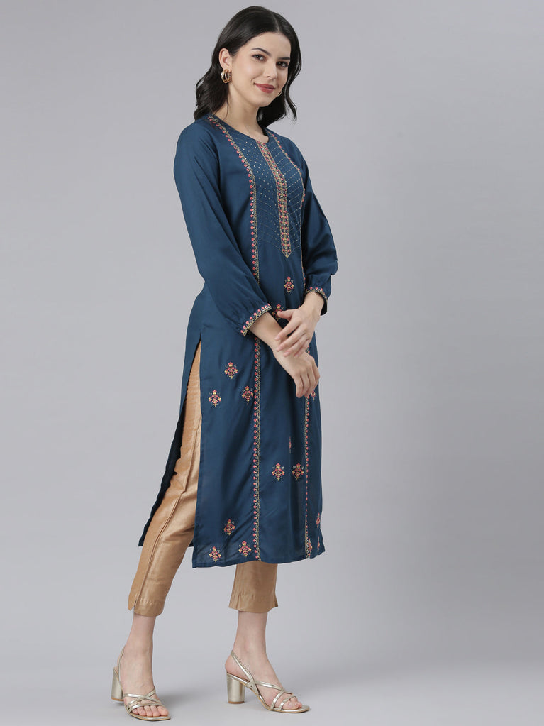 Indulge In The Craftsmanship Of The Neeru's Blue Regular Straight Embroidered Kurtas, Crafted To Exude Sophistication And Elegance.